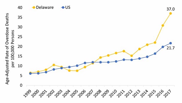 Delaware is also currently above the national average for opioid-related overdose deaths, with 21.7 deaths per 100,000 people while the national average is 14.6 deaths. Overdose deaths remained consistently above the national average from 2008 to 2016 and have risen drastically in 2016 and 2017 with 37.0 deaths per 100,000 people in 2017.[2] Delaware enacted legislation that restricted opioid prescriptions to 7 days beginning in 2017. Long-term opioid treatment is available, but only after certain criteria is met including regular queries of the State Prescription Drug Monitoring Program.