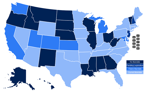 At the time of this blog’s publication, 30 of the 50 states have an active or future (passed but not active) mandate!